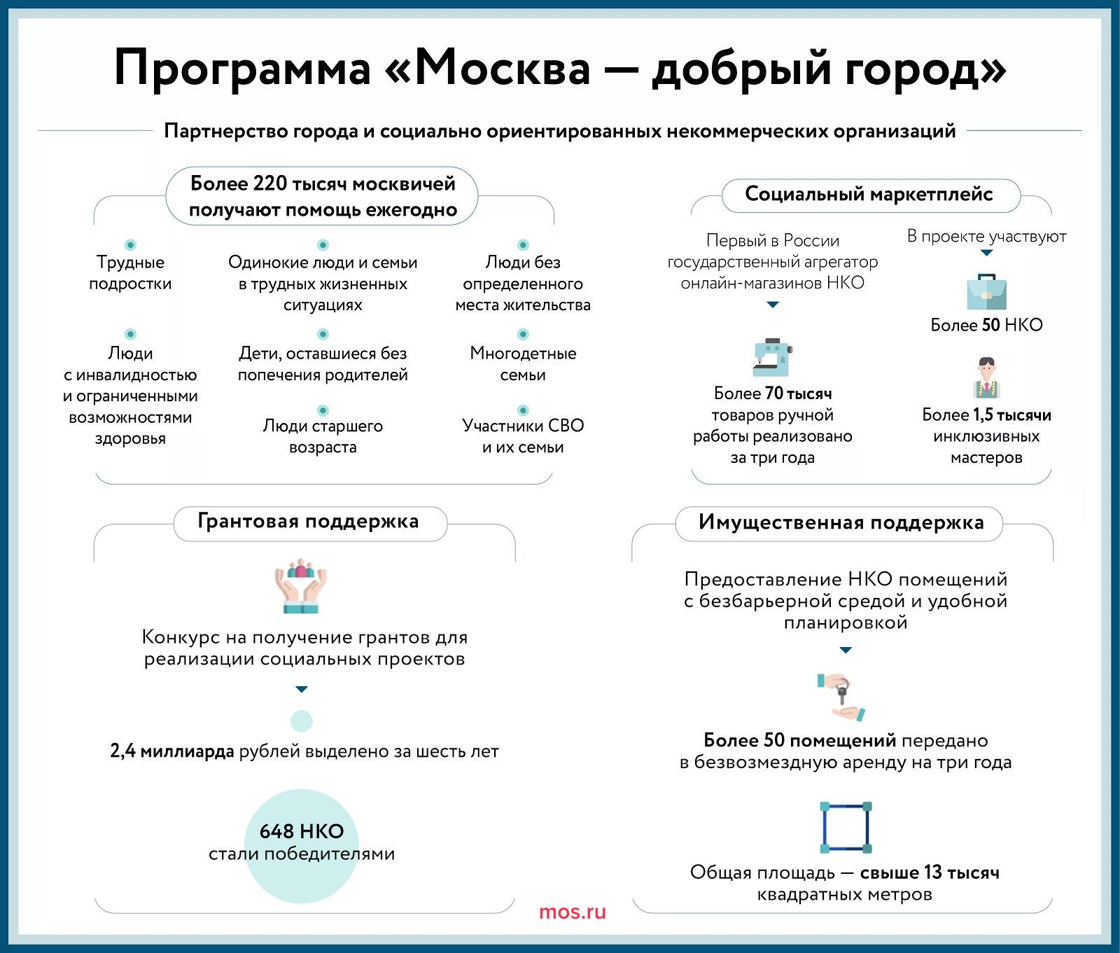 «Участниками конкурса грантов становятся некоммерческие организации, которые помогают москвичам с особенностями здоровья, многодетным семьям, сиротам, людям в трудных жизненных ситуациях, участникам специальной военной операции и членам их семей, а также другим категориям горожан, нуждающихся в поддержке. Школа же, в свою очередь, позволяет командам НКО максимально точно сформировать свои программы под социальные потребности и получить необходимую поддержку от города», — говорит заместитель начальника отдела по работе с НКО столичного Департамента труда и социальной защиты населения Оксана Чикова.
