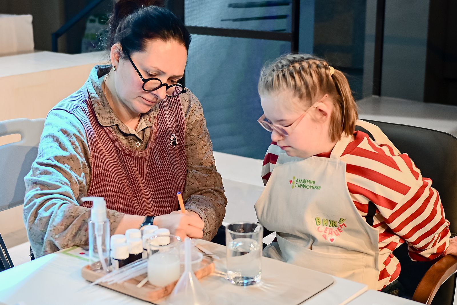 В лаборатории пахло мандаринами, хвоей и сладкой выпечкой. Тема финального мастер-класса — «Зимняя сказка». На столах — ряды флаконов с надписями на шрифте Брайля: «цитрусы», «хвоя», «корица» и «ваниль». В работе над уникальными авторскими композициями ребятам помогали наставники, выступившие в роли ассистентов, как в настоящих парфюмерных лабораториях.